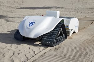 An electric beach-cleaning robot named BeBot has begun scouring the shoreline in front of FINNS Beach Club, sifting through sand to extract cigarette butts, plastic